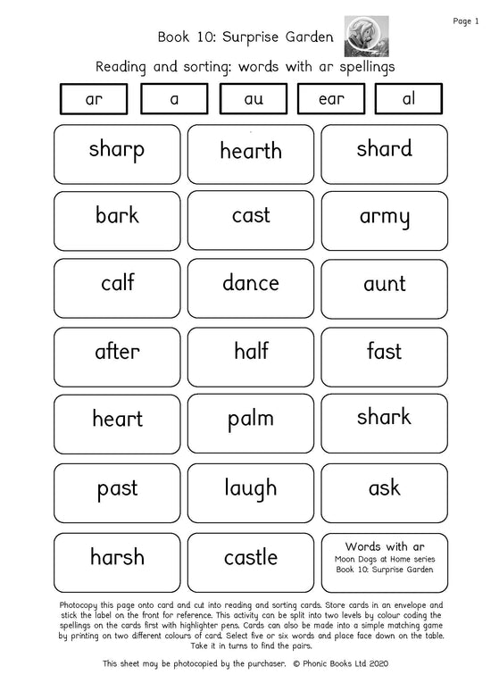 Moon Dogs at Home Book 10 Surprise Garden activity sheets cover the spellings <ar>, <a>, <al>, <ear> and <au> for the sound ‘ar’.