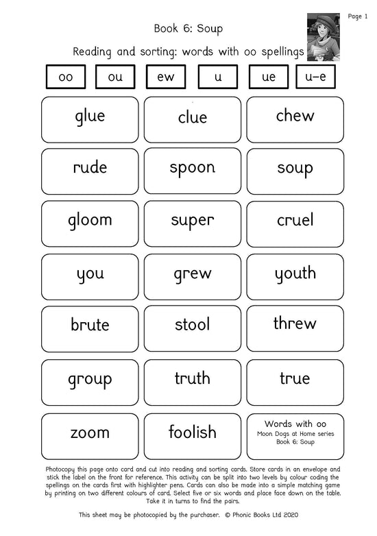 Moon Dogs at Home Book 6: Soup activity sheets cover the spellings <oo> <ou> <ew> <u> <ue> and <u-e> for the sound 'oo'.