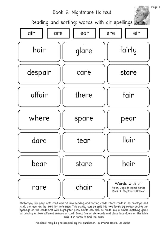 Moon Dogs at Home Book 9: Nightmare Haircut: This book introduces the spellings <air>, <are>, <ear>, <ere> and <eir> for the sound ‘air’.